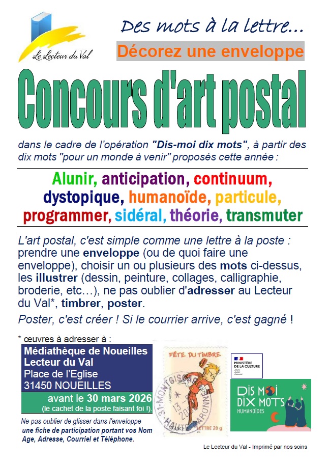 Dans le cadre de l’Opération "Dis-moi dix mots" et de la Semaine de la Langue française et de la Francophonie 2026, Le Lecteur du Val propose donc un concours d’art postal consistant à illustrer, sur une enveloppe qui voyagera par la Poste, les "dix mots pour un monde à venir" proposés cette année par la Délégation Générale à la Langue Française et aux Langues de France :