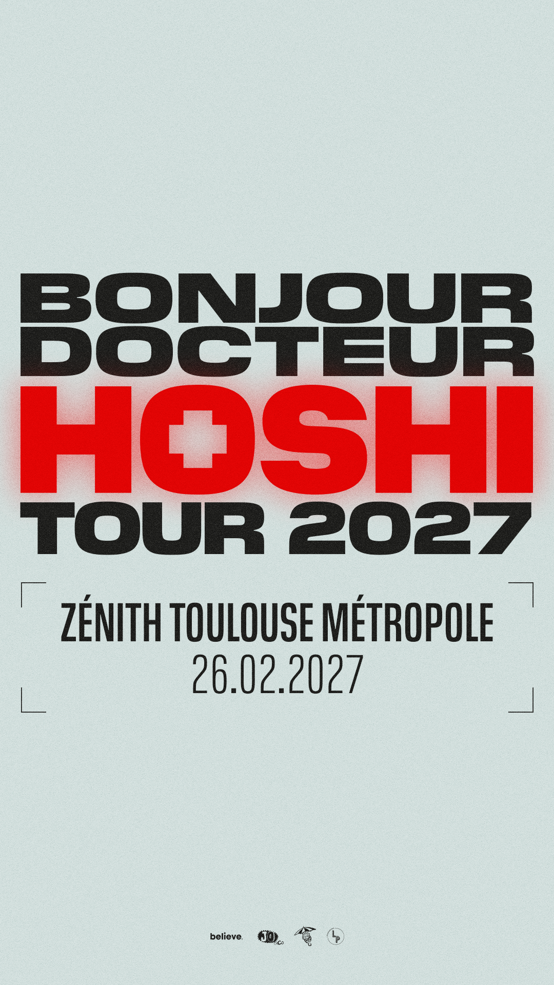 Portée par le succès fulgurant du Cœur Parapluie Tour, avec près de 100 concerts et plus d’un demi-million de spectateurs, Hoshi revient en 2027 avec Bonjour Docteur Tour, une tournée évènement qui ouvre les portes d’un nouveau chapitre de son univers.