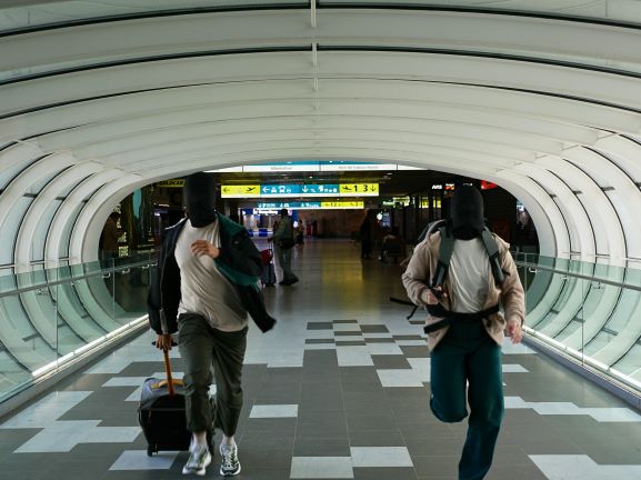 Dans un futur proche, deux artistes ratent leur vol vers la ville où ils doivent présenter leur spectacle. Les voilà piégés dans l’aéroport, ce non-lieu suspendu entre départ et arrivée. Leur espace de transit se métamorphose en un huis clos, et leur intention de jouer se transforme en une quête de sens, au cœur d’un lieu flottant entre réel et virtuel, présence et absence. Ils ne sont pas simplement en retard : ils sont ailleurs, entre ici et nulle part, immobiles.