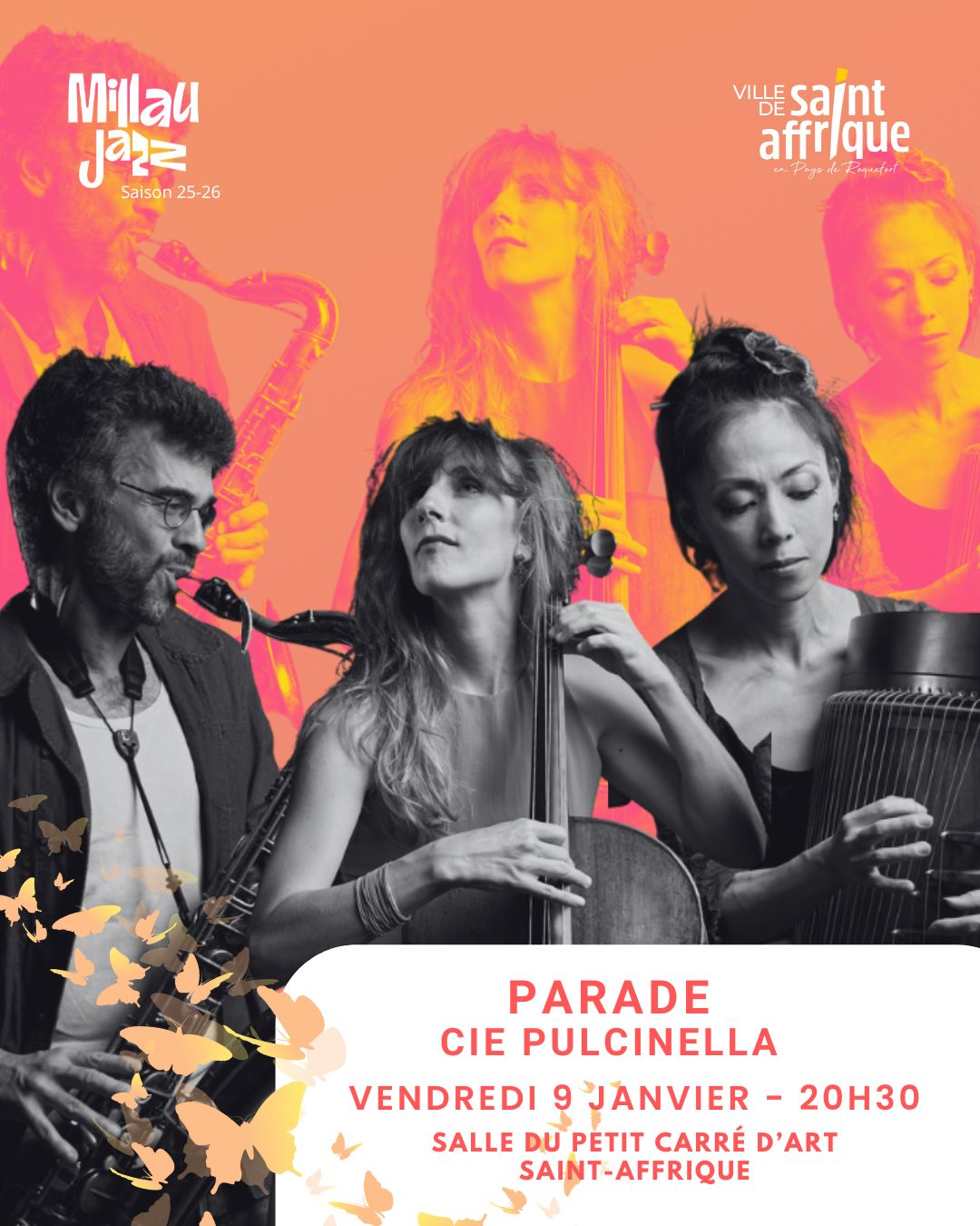 Site web : https://millaujazz.fr/saison-millau-en-jazz/parade-cie-pulcinella-vendredi-9-janvier-2026/