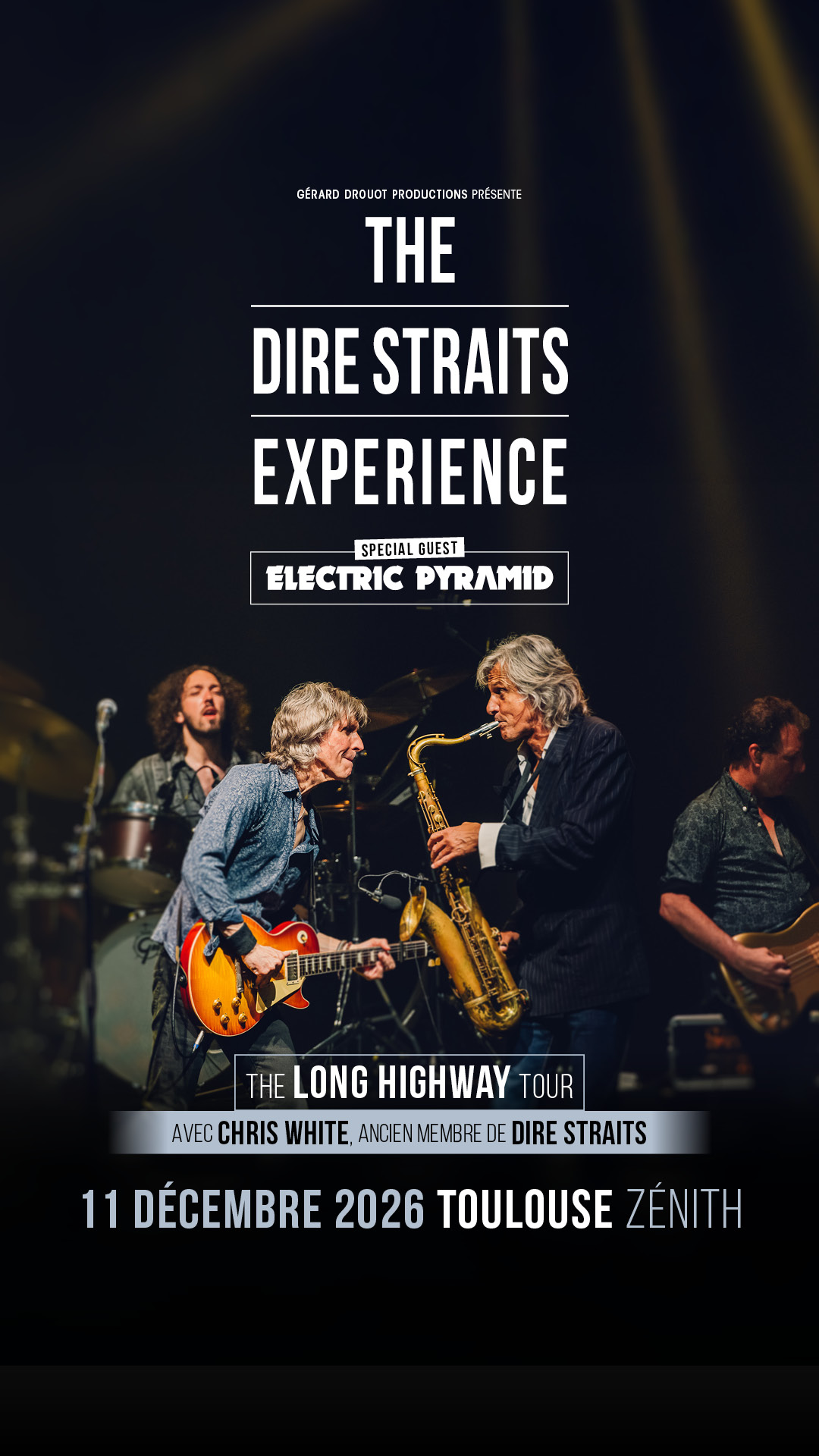 Mené par Chris White, membre originel de Dire Straits, et accompagné par six musiciens de renommée internationale, The Dire Straits Experience propose un concert live d’exception, interprétant les plus grands titres de ce répertoire comme Sultans of Swing, Money for Nothing, Private Investigations et bien d’autres encore.