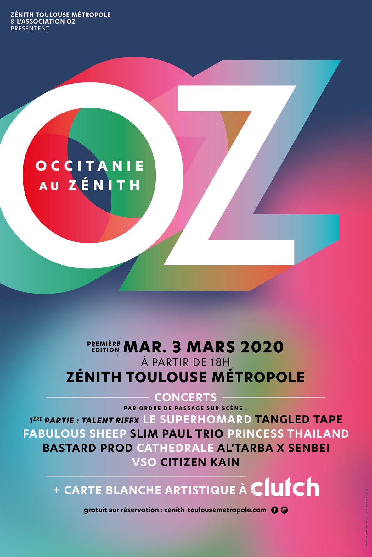 La première édition de OZ - Occitanie au Zénith aura lieu le mardi 3 mars 2020 au Zénith Toulouse Métropole. Ce nouvel événement gratuit est dédié à la création musicale et artistique et à l’émergence culturelle de la région Occitanie. Le Zénith Toulouse Métropole, lieu emblématique des musiques populaires en région, ouvre ses portes aux artistes professionnels émergents à confirmés de différentes esthétiques : musiques urbaines, pop-rock, musique électronique… Cette soirée sera l’occasion de découvrir le Zénith sous un angle inédit ! De 18h00 à minuit, une dizaine d’artistes/groupes de musiques actuelles se succèderont sur les deux scènes non-stop comme en festival, et le grand hall sera le terrain de jeu du magazine toulousain Clutch, organisateur des fameuses Clutcho’. Le Zénith propose un événement gratuit, accessible à tous, et à contre-courant de sa programmation habituelle, en accueillant des artistes émergents n’ayant pas accès à la salle par la voie classique (location de la salle par un producteur). La réalisation de cette opération et sa gratuité sont rendues possibles grâce au concours, en premier lieu, de la Région Occitanie et aussi de la Sacem, du Crédit Mutuel et de Toulouse Métropole.