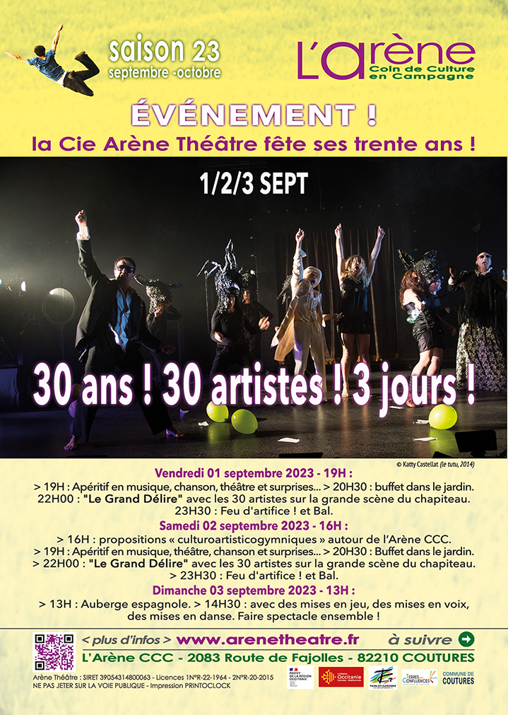 Evènement ! La Cie Arène Théâtre a 30 ans ! Chansons, musiques, danse, surprises, "Le Grand Délire", buffet, feu d’artifice, bal... !