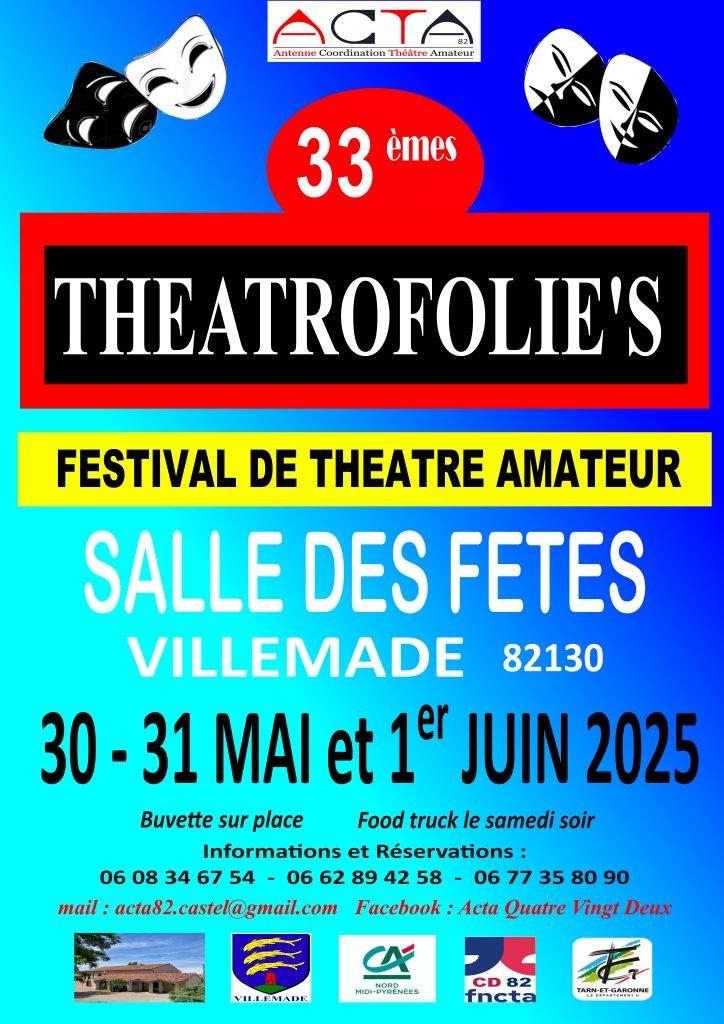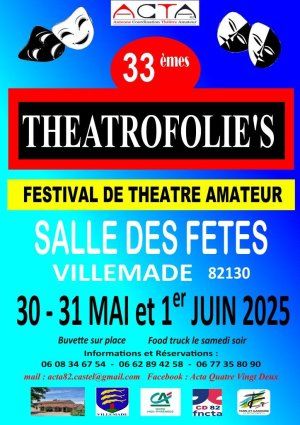 Festival itinérant de Théâtre amateur s’installe cette année à Villemade (82130), vous y retrouverez les troupes : l’Atelier des 2 rives de Donzac, L’Alva théâtre jeune de Valence d’Agen, L’Alvanture de Valence d’Agen, La Luciole de Bioule, le TAM de Moissac, les Tamalloux de Bioule, T.E.I. de Montauban, Les Santufayons de Beauzelle.