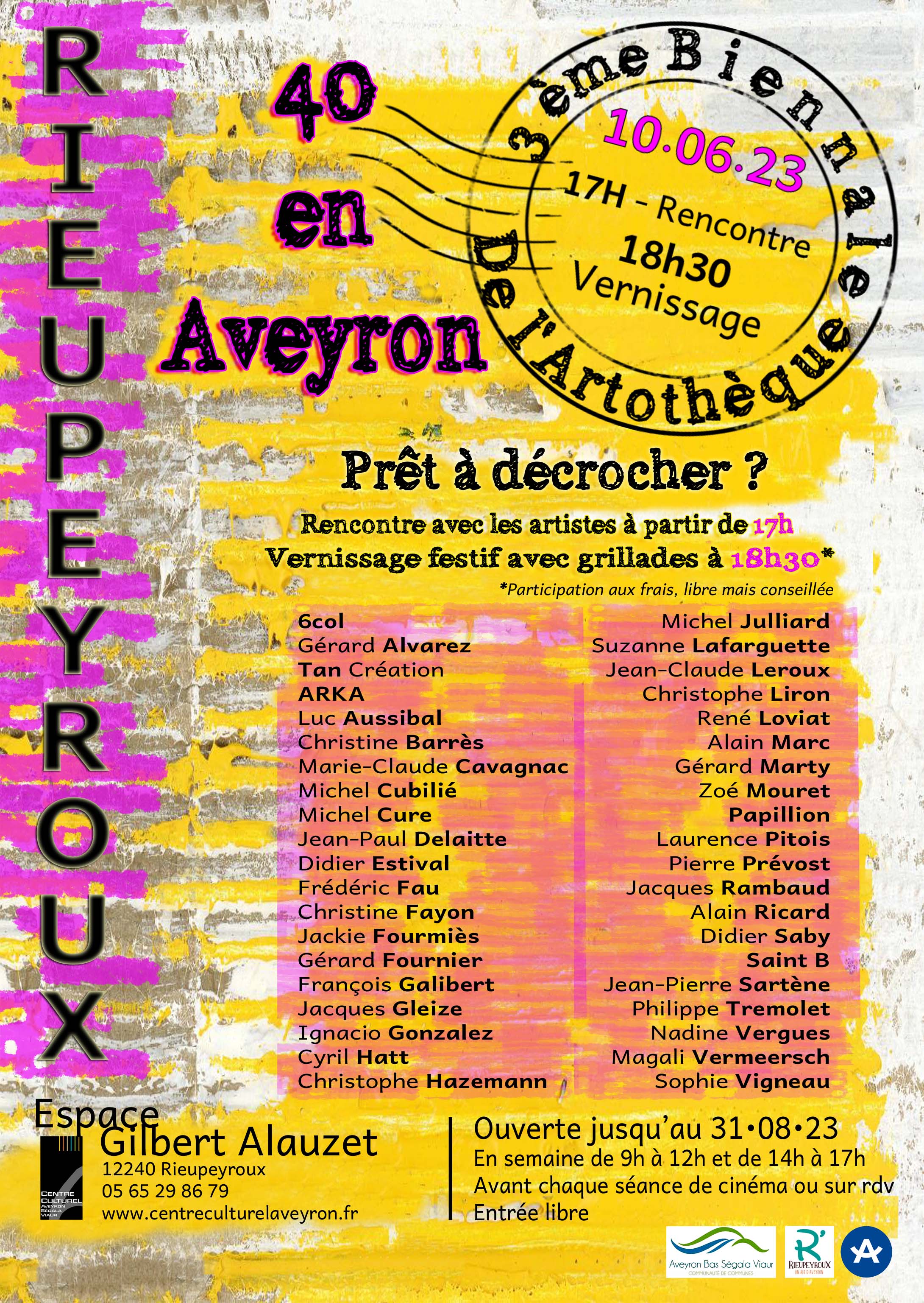 L’équipe du Centre Culturel Aveyron Ségala Viaur, vous accueillera avec les artistes présents. L’occasion d’échanger, de partager des points de vue, de compléter ses connaissances... et pourquoi pas de repartir avec une œuvre de 6col . Gérard Alvarez . Tan Création . ARKA . Luc Aussibal . Christine Barrès . Marie-Claude Cavagnac . Michel Cubilié . Michel Cure . Jean-Paul Delaitte . Didier Estival . Frédéric Fau . Christine Fayon . Jackie Fourmiès . Gérard Fournier . François Galibert . Jacques Gleize . Ignacio Gonzalez . Cyril Hatt . Christophe Hazemann . Michel Julliard . Suzanne Lafarguette . Jean-Claude Leroux . Christophe Liron . René Loviat . Alain Marc . Gérard Marty . Zoé Mouret . Papillion . Laurence Pitois . Pierre Prévost . Jacques Rambaud . Alain Ricard . Didier Saby . Saint B . Jean-Pierre Sartène . Philippe Tremolet . Nadine Vergues . Magali Vermeersch . Sophie Vigneau