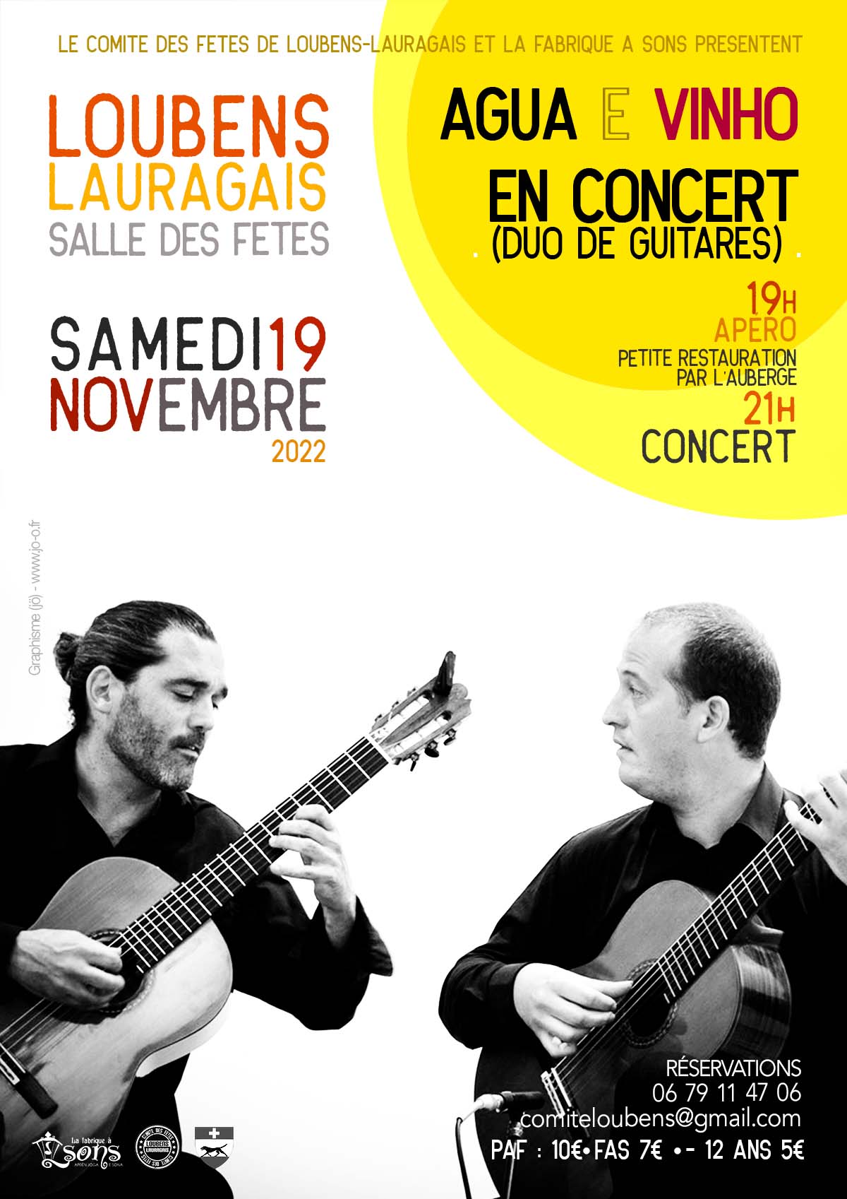 Après le succès de l’exceptionnelle soirée tango du 15 Octobre dernier, le "comiteuf de Loubens-Lauragais" et "la fabrique à sons : école de musique de Loubens" sont très heureux de vous convier au concert du duo de guitares "Agua e Vinho" qui aura lieu dans notre salle des fêtes le samedi 19 Novembre prochain avec dès 19h, l’apéro du comité et une petite restauration de l’auberge de Loubens, suivis du concert à 21h.
