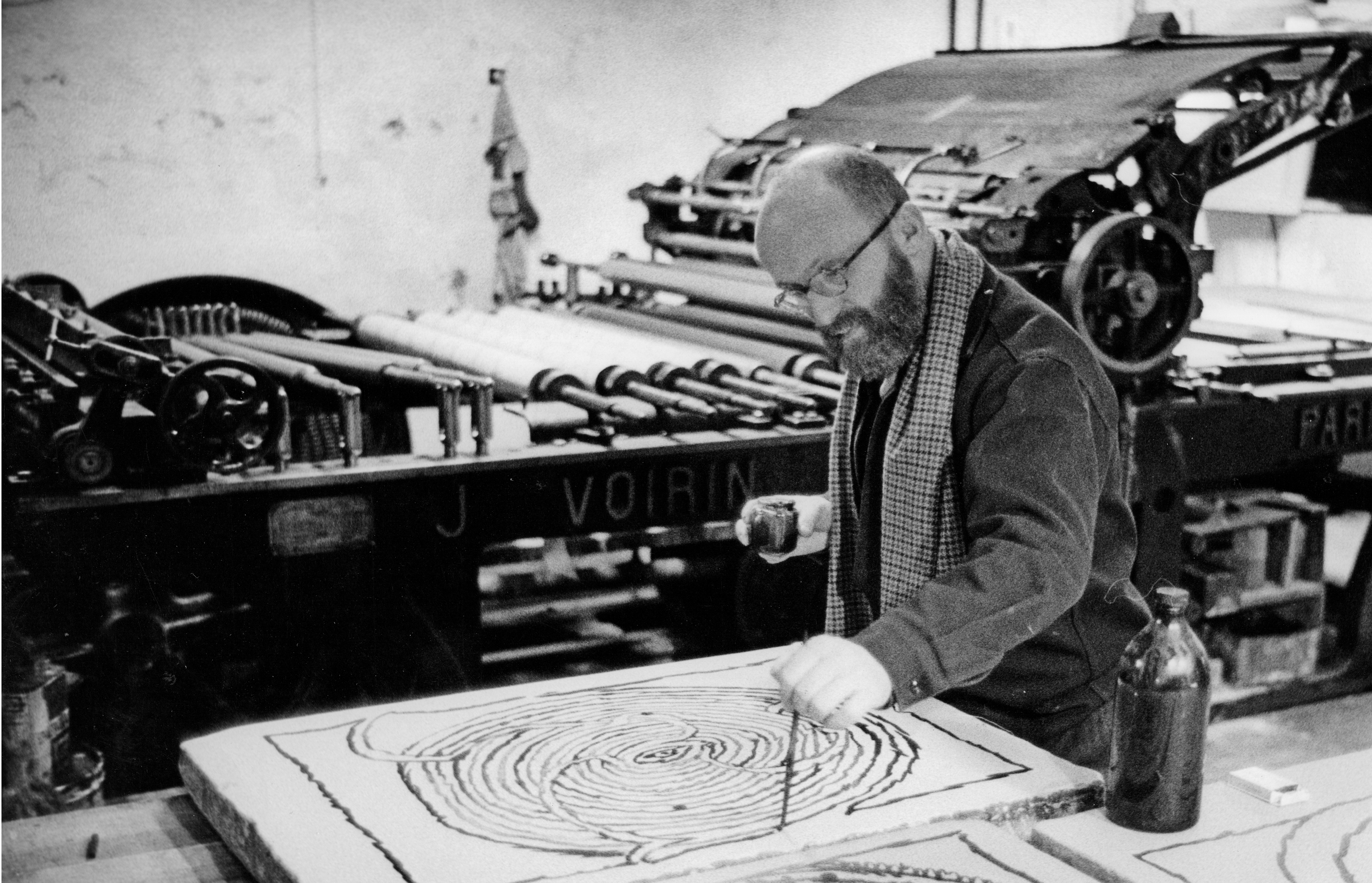 Auteur notamment de la grande fresque en lave émaillée qui orne l’entrée du musée et résident permanent des lieux – une salle lui est consacrée –, le peintre a entretenu avec l’imprimeur et éditeur Pierre-André Benoît une fructueuse collaboration qui a donné lieu à 22 éditions de livres d’artiste. Il a en effet hérité de sa formation de typographe de nombreuses affinités avec le monde de l’écriture et de l’imprimerie. Usage de l’encre et du pinceau chinois, graphisme proche de la calligraphie, fascination pour le papier, réemploi de documents d’archives… jalonnent huit décennies de création artistique. En hommage à l’amitié qui le liait à PAB, il se plie à l’exercice de la carte blanche et expose près de 200 œuvres sur papier rarement montrées, dessins, gravures, papiers marouflés et livres d’artistes. MR