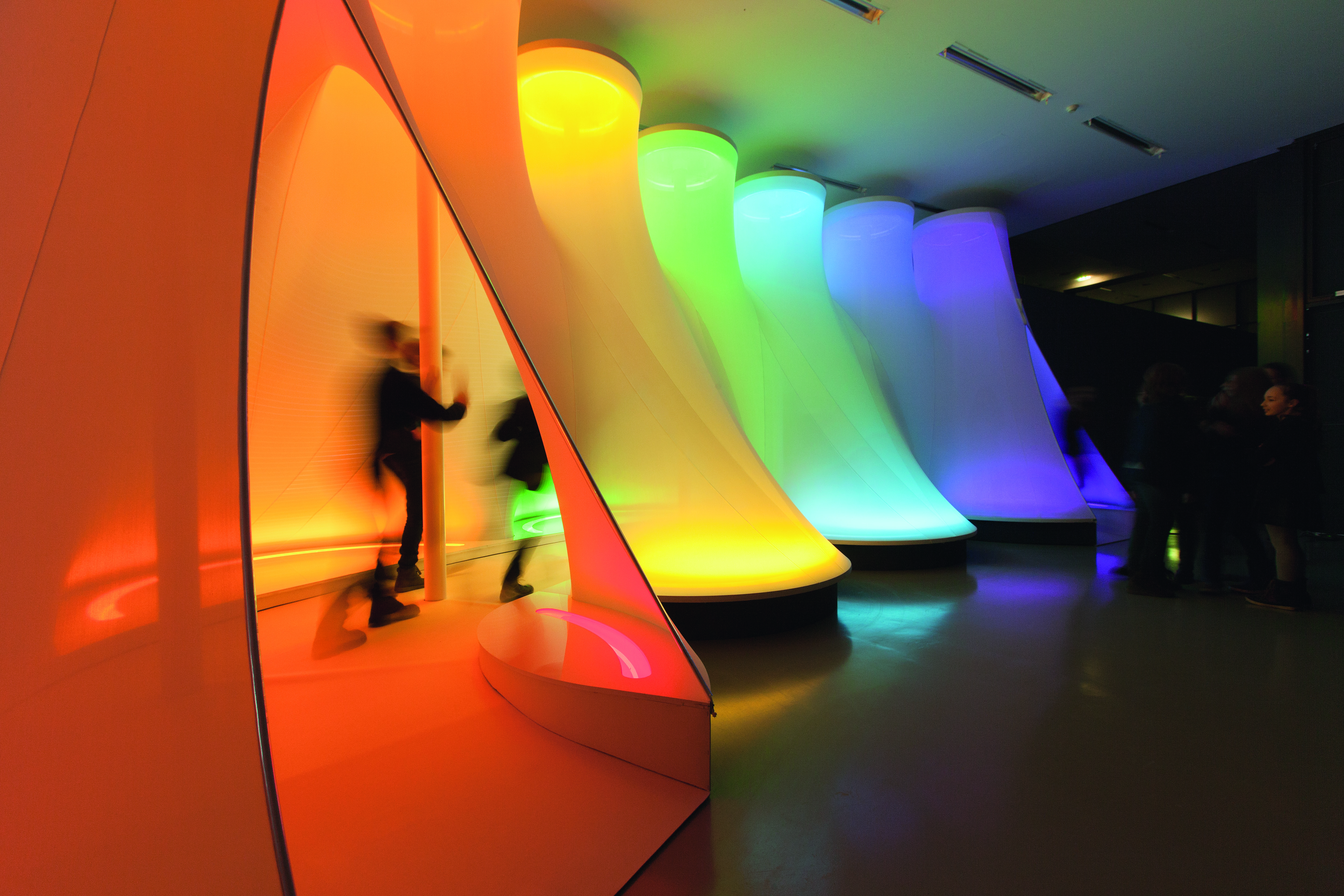 Synthetic fabric, neon lamps, colored filters, steel, aluminum, plywood, plastic