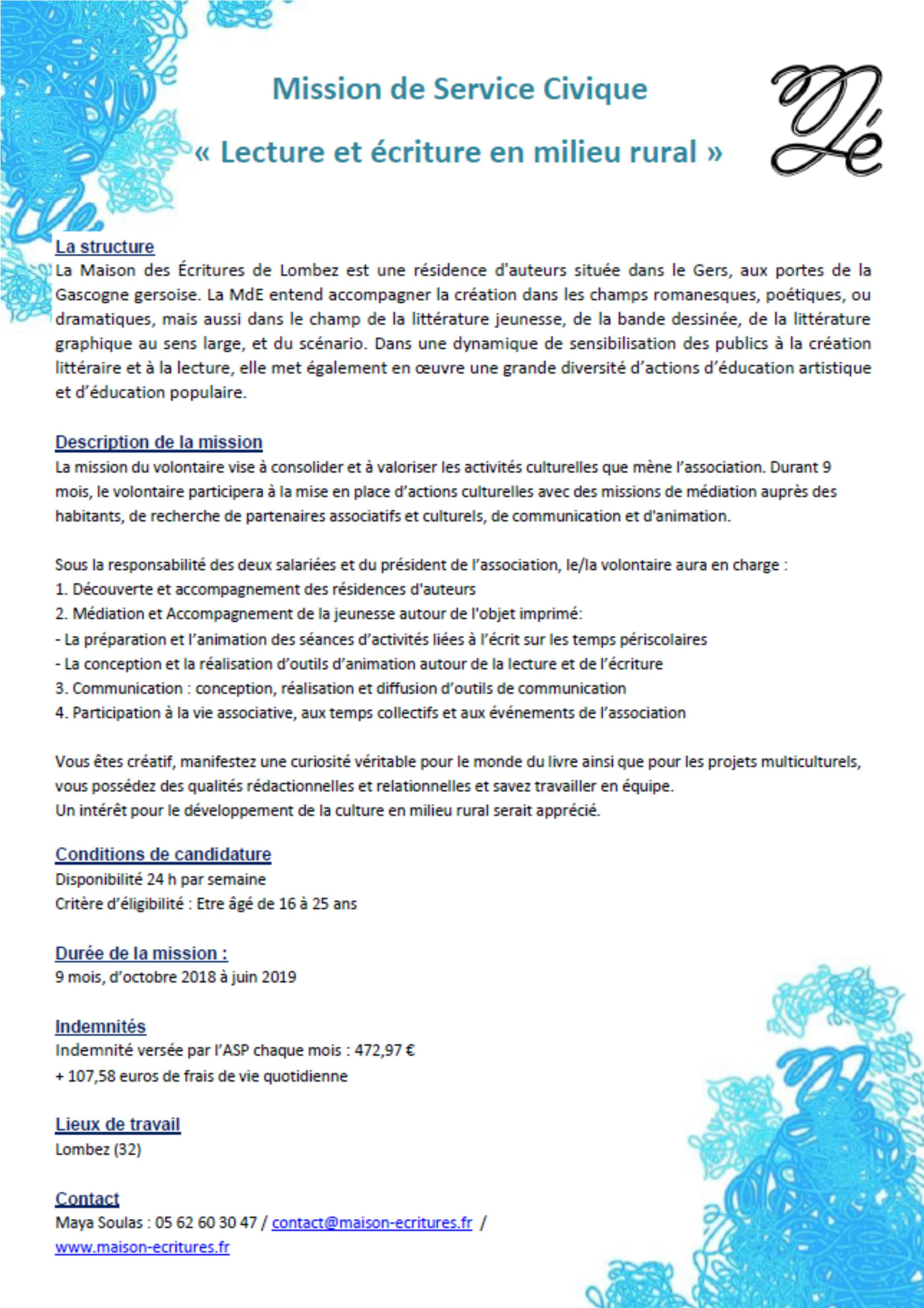 Site web : https://www.maison-ecritures.fr/agenda/recrutement-mission-de-service-civique/
