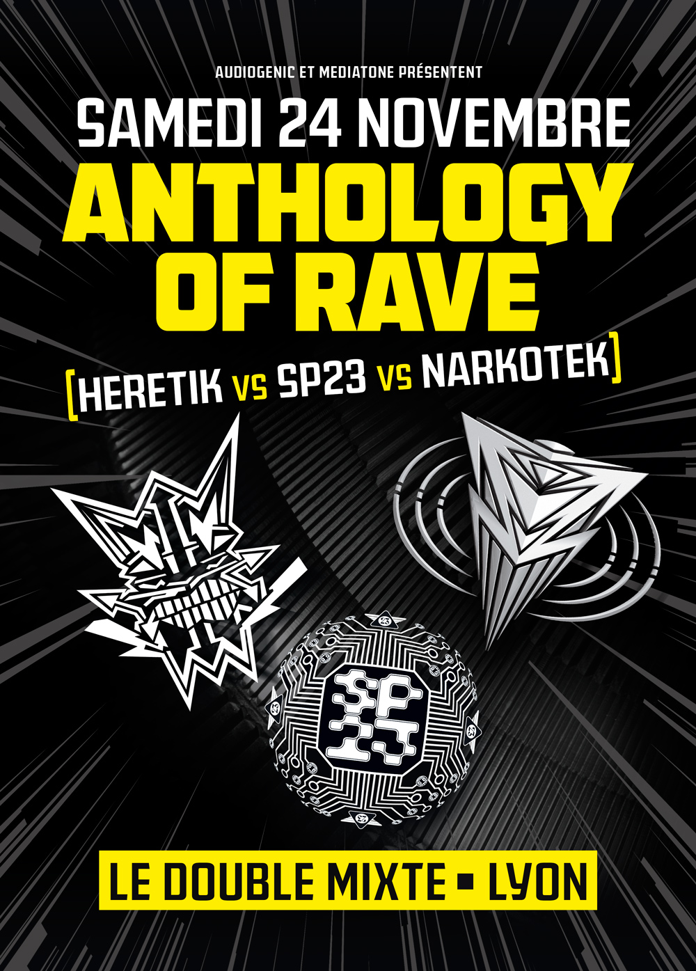 Les mythiques sound-systems Heretik, Spiral Tribe et Narkotek se rassemblent le temps d’une nuit pour une date unique à Lyon le samedi 24 novembre 2018 !