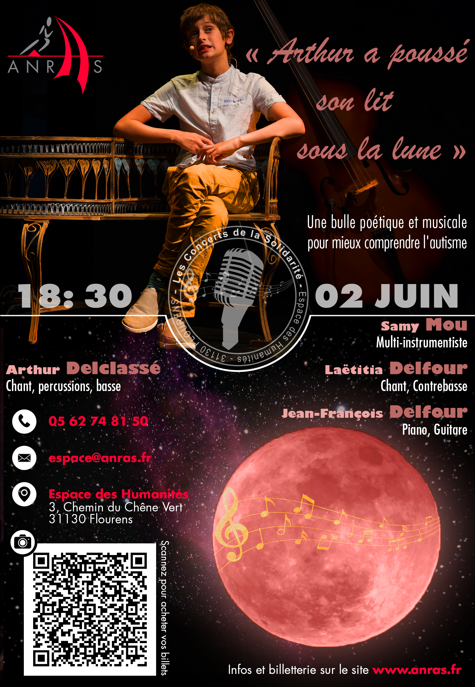 "Arthur a poussé son lit sous la lune" , c’est l’histoire vraie, d’un petit bonhomme particulier, porteur d’autisme, qui traverse la vie du mieux qu’il peut avec un réel enthousiasme et une grande passion pour la musique et le chant. De sa naissance à ses douze ans aujourd’hui, la musique l’a toujours aidé à appréhender ce monde un peu compliqué pour lui et les proches qui l’accompagnent.