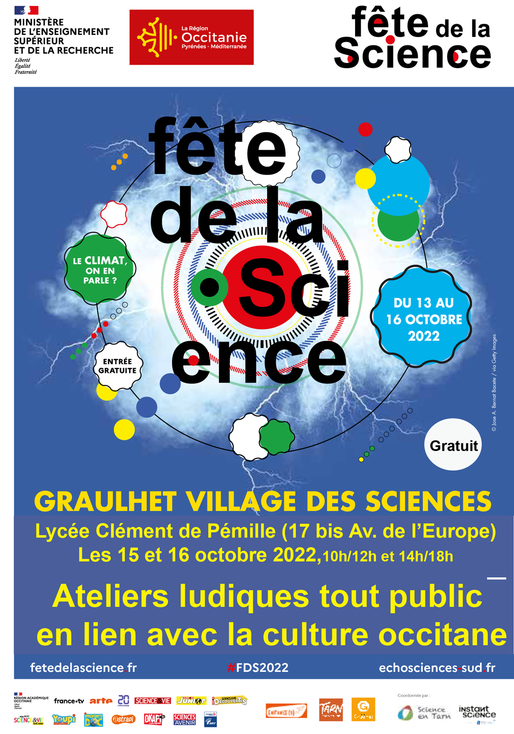Nous serons présents les 15 et 16 octobre 2022, de 10h à 12h et de 14h à 18h, au Village des Sciences, qui sera situé au Lycée Clément de Pémille (17 bis avenue de l’Europe - 81300 Graulhet).