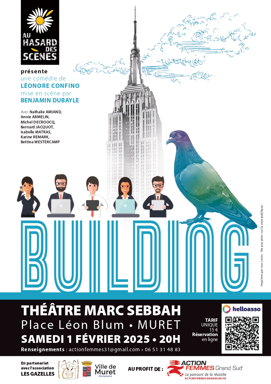 Sept comédiens de la Compagnie toulousaine “Au hasard des Scènes” joueront la pièce « Building », une comédie grinçante pointant les difficultés rencontrées par des femmes et des hommes travaillant dans une entreprise où la folie explose dans un grand éclat de rire.
