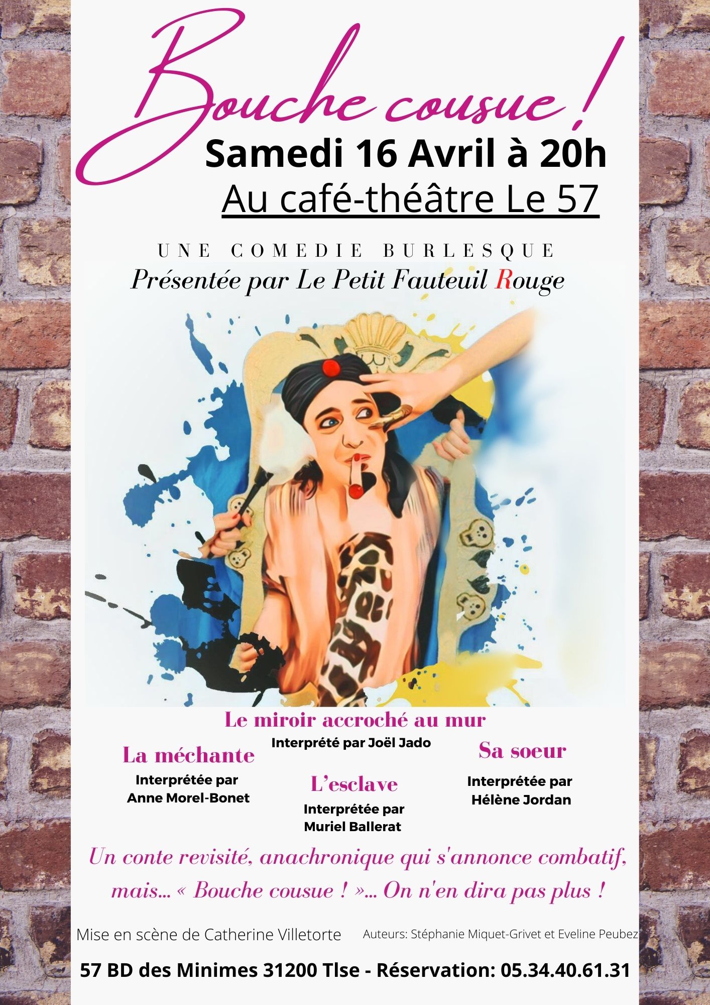 Vous tomberez en plein conte et règlement de comptes à coup de formules magiques et de mots fratricides, une parodie avec beaucoup d’humour et de dérision. Une rivalité entre deux soeurs, dont les rancœurs de l’enfance refont surface. Comme dans un conte classique "il était une fois" dans un vieux manoir : une méchante rancunière, une esclave hypocrite, une jeune sœur crédule. Et au milieu, un miroir plus vrai que nature prisonnier de ce manoir et de ses secrets…