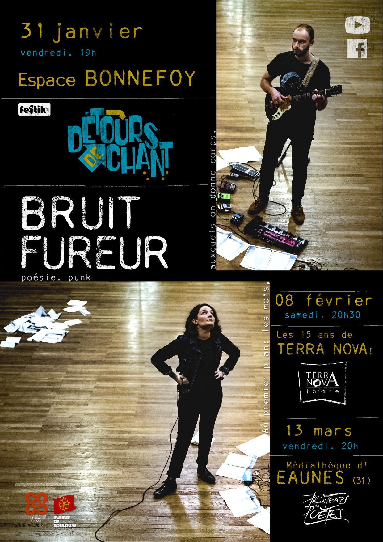 *** Leur dernière création, BRUIT FUREUR, est un duo voix parlée / guitare électrique, poésie punk, sur des textes de littérature contemporaine - qui milite en actes pour une certaine conception de la lecture, vivante et sensitive, une approche transdisciplinaire de l’art et une égalité femme-homme effective dans toutes les étapes de travail.
