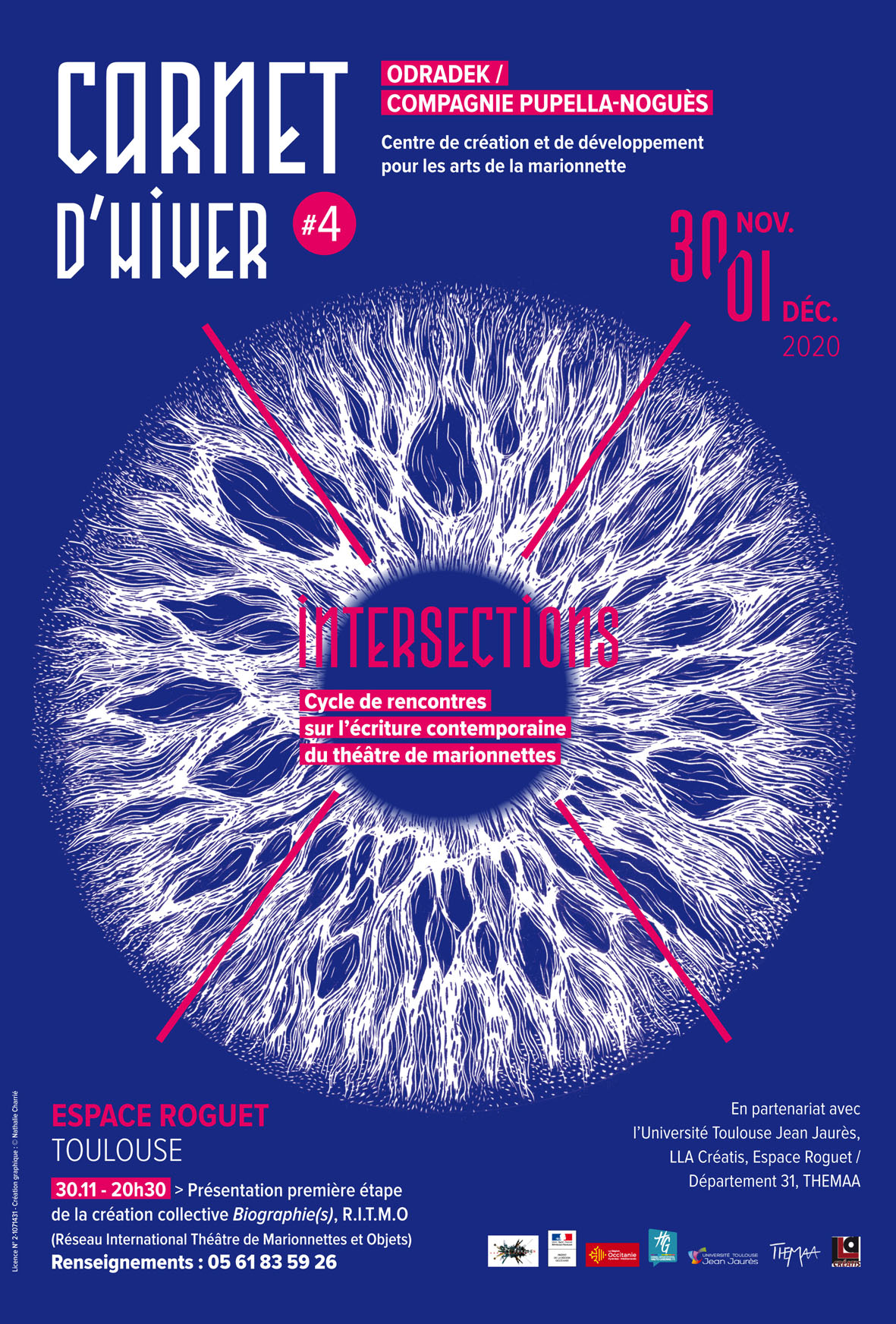 Carnet d’Hiver #4 est un événement proposé et organisé par Odradek/Pupella-Noguès, en partenariat avec l’Université Jean-Jaurès-Toulouse (LLA Creatis), l’Espace Roguet (Conseil Départemental de la Haute Garonne) et l’Association Themaa.