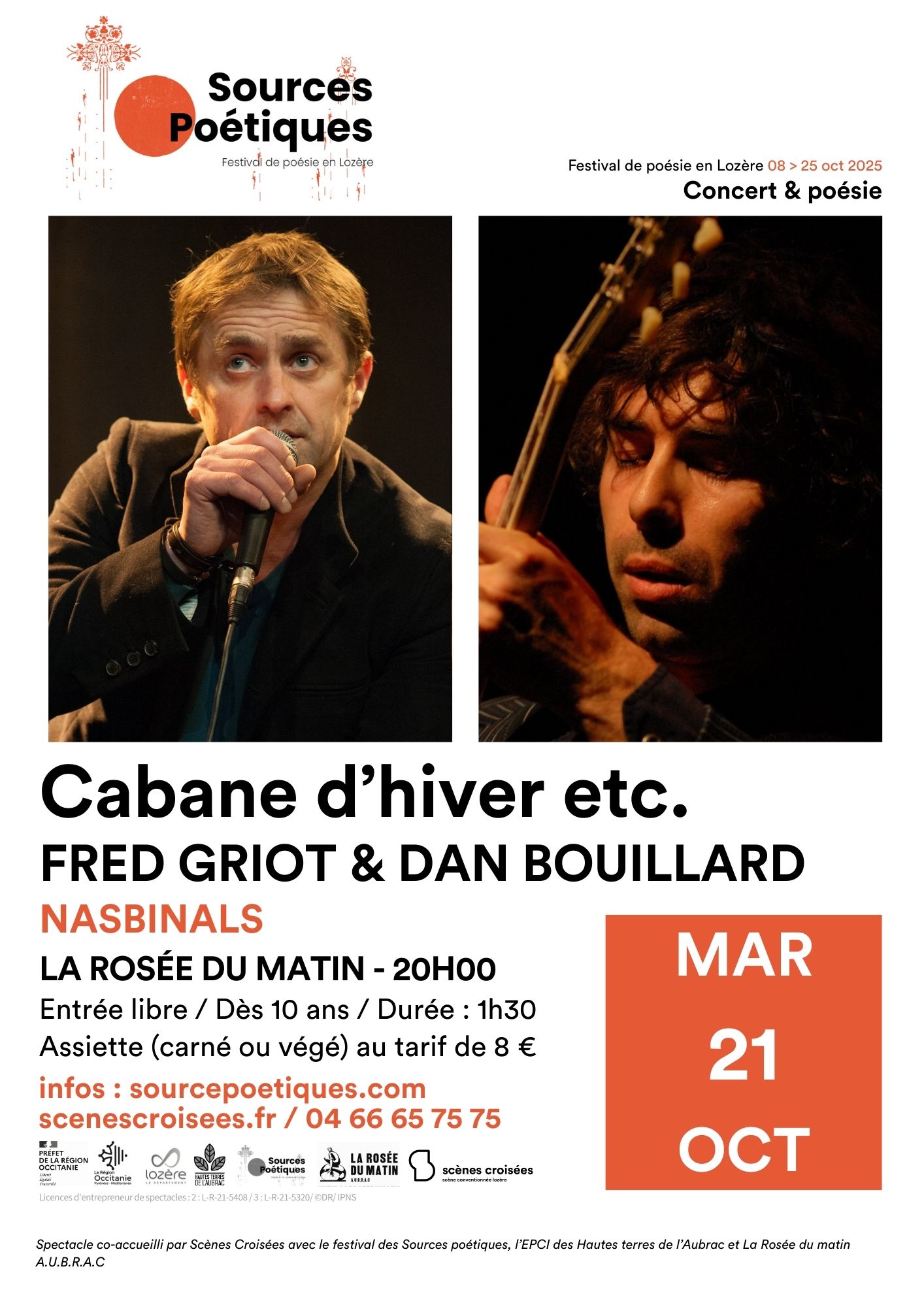 Fred Griot, poète et interprète, vous dira des textes tirés de son livre Cabane d’hiver et d’autres poèmes. Sa voix forte et sensible est portée par la guitare électrique de Dan Bouillard.