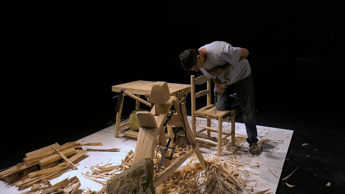 Un homme, un tronc de châtaigner, quelques outils traditionnels, un paquet de gestes précis et 1h40 de travail ! Pep Aymerich, artiste et menuisier, construit sous nos yeux une chaise à la main, en temps réel et à l’échelle 1. Simplicité et technicité, temps long et rythme constant participent, dans cette performance, à la création d’un objet du quotidien que vous aurez hâte de découvrir finalisé dès le premier coup de hache. Alors que vous assistez au processus physique de fabrication d’une simple chaise, les frontières entre menuiserie et performance artistique, entre art et artisanat se diluent. Loin des artifices et des impostures, l’homme se penche avec labeur sur son établi, construit lui aussi à la main pour cette œuvre.