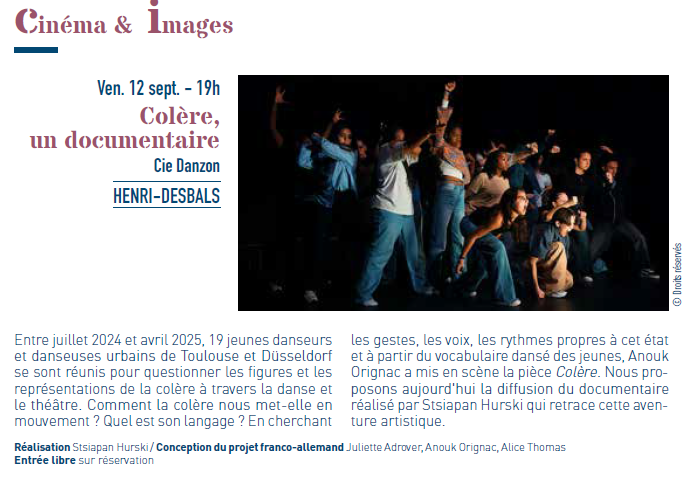 Entre juillet 2024 et avril 2025, 19 jeunes danseur.euses urbains de Toulouse et Düsseldorf se sont réunis pour questionner les figures et les représentations de la colère à travers la danse et le théâtre. Comment la colère nous met-elle en mouvement ? Quel est son langage ? En cherchant, les gestes, les voix, les ryhtmes propres à cet état et à partir du vocabulaire dansé des jeunes, Anouk Orignac a mis en scène la pièce Colère. Nous proposons le vendredi 12 septembre au Centre Culturel Henri Desbals la diffusion du documentaire réalisé par Stsiapan Hurski qui retrace cette aventure artistique.