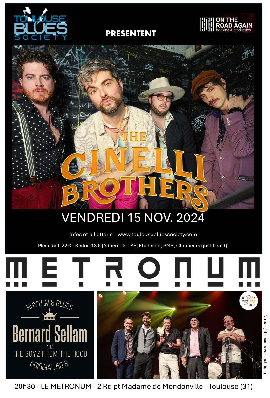 La TOU BLUES SOCIETY marque cette fin d’année par un concert événement, en invitant au Metronum en novembre THE CINELLI BROTHERS, groupe anglais le plus marquant de la scène internationale 2024 ! Après plusieurs albums multirécompensés en UK, ils terminent Finalistes de l’International Blues Challenge de Memphis (USA) en 2023, leur tournée Internationale affiche complet depuis et pour cause !! Elle permet aux chanceux de déguster sans aucune modération leurs compositions originales Soul Funky Blues pure tradition mais sur-vitaminées, propulsées par la présence scénique hors du commun de ces 4 jeunes lascars multi-instrumentistes de talent !