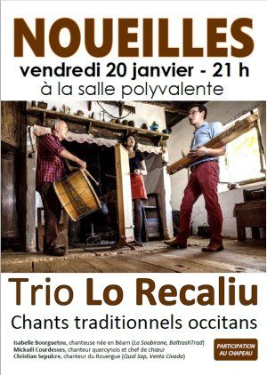 La Médiathèque de Noueilles invite, le vendredi 20 janvier en soirée, à un concert de chants traditionnels, en occitan et en français, par le trio "Lo Recaliu", qui sera en résidence à Grépiac du 20 au 22 janvier.