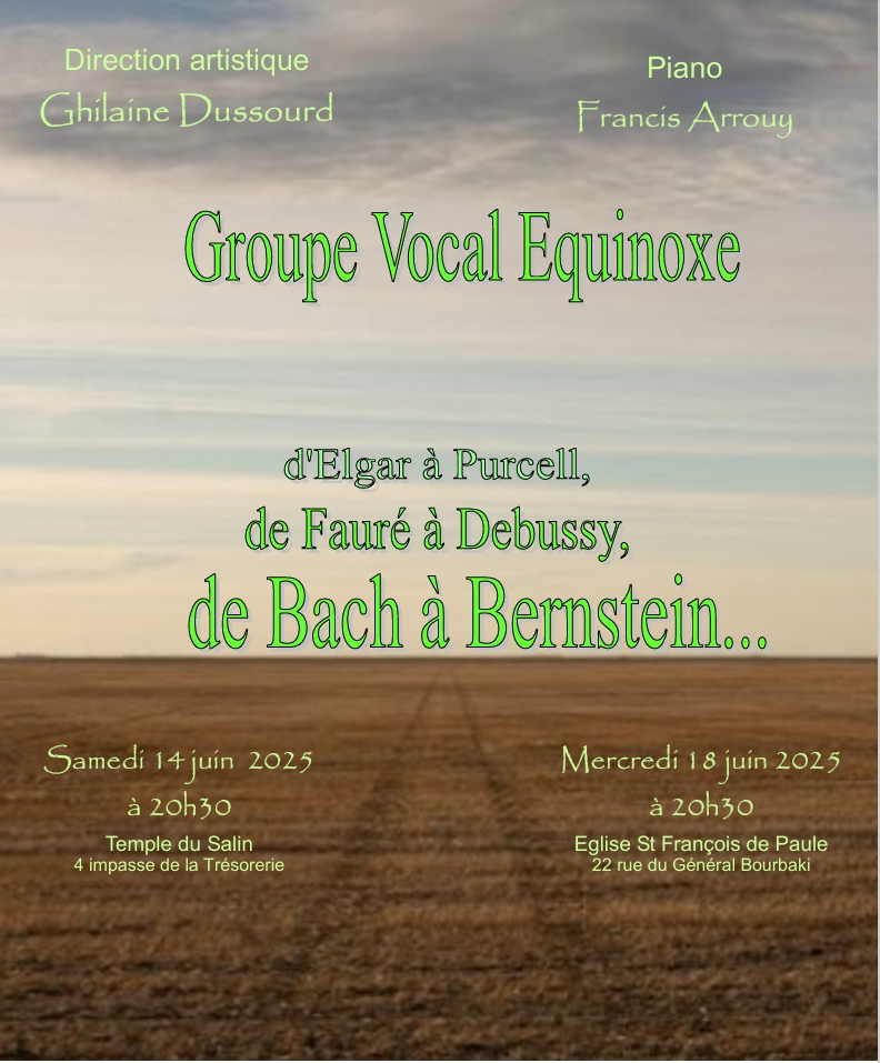 Le Groupe Vocal Equinoxe donnera cette année deux concerts sous la direction de Ghilaine DUSSOURD avec l’accompagnement au piano de Francis ARROUY.
