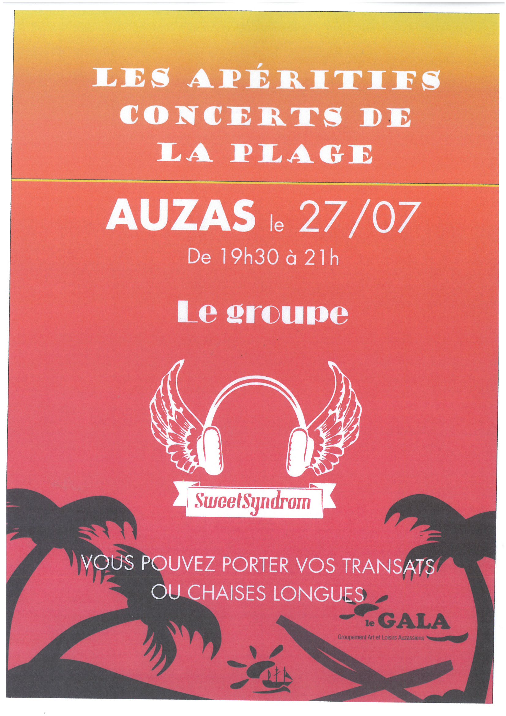 Le jeudi 27 juillet 2017 de 19h30 à 21h venez assister au concert de "SweetSyndrom". Un apéritif précédera le concert. Vous pourrez apporter vos transats ou chaises longues.