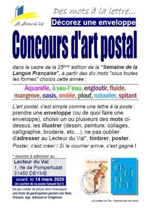 Dans le cadre de la 25ème édition de la Semaine de la Langue Française, Le Lecteur du Val propose un concours d’art postal consistant à illustrer, sur une enveloppe qui voyagera par la Poste, les "dix mots sous toutes les formes" proposés cette année par la Délégation Générale à la Langue Française et aux Langues de France : aquarelle, à vau-l’eau, engloutir, fluide, mangrove, oasis, ondée, plouf, ruisseler, spitant.