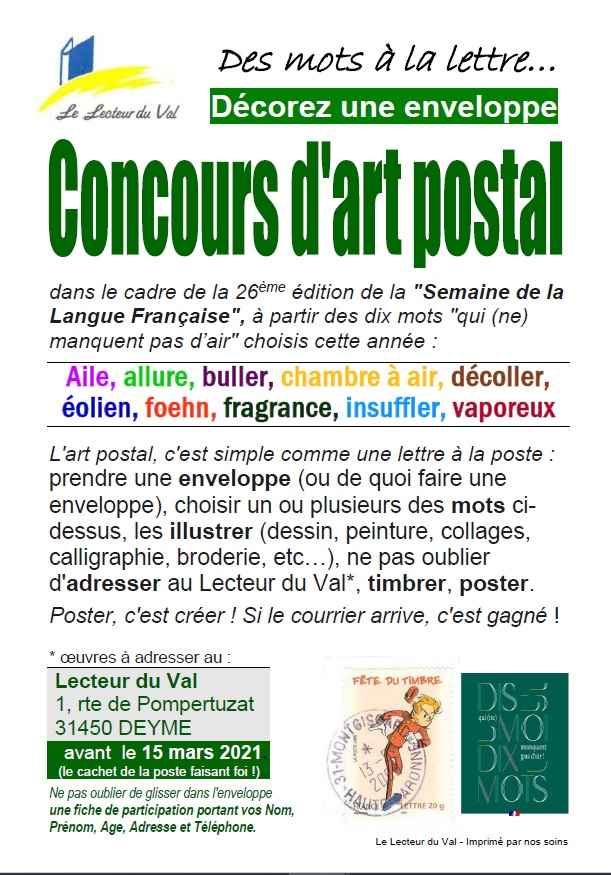 Dans le cadre de la 26ème édition de la Semaine de la Langue Française, Le Lecteur du Val propose un concours d’art postal consistant à illustrer, sur une enveloppe qui voyagera par la Poste, les "dix mots au fil de l’eau" proposés cette année par la Délégation Générale à la Langue Française et aux Langues de France : aile, allure, buller, chambre à air, décoller, éolien, foehn, fragrance, insuffler, vaporeux.