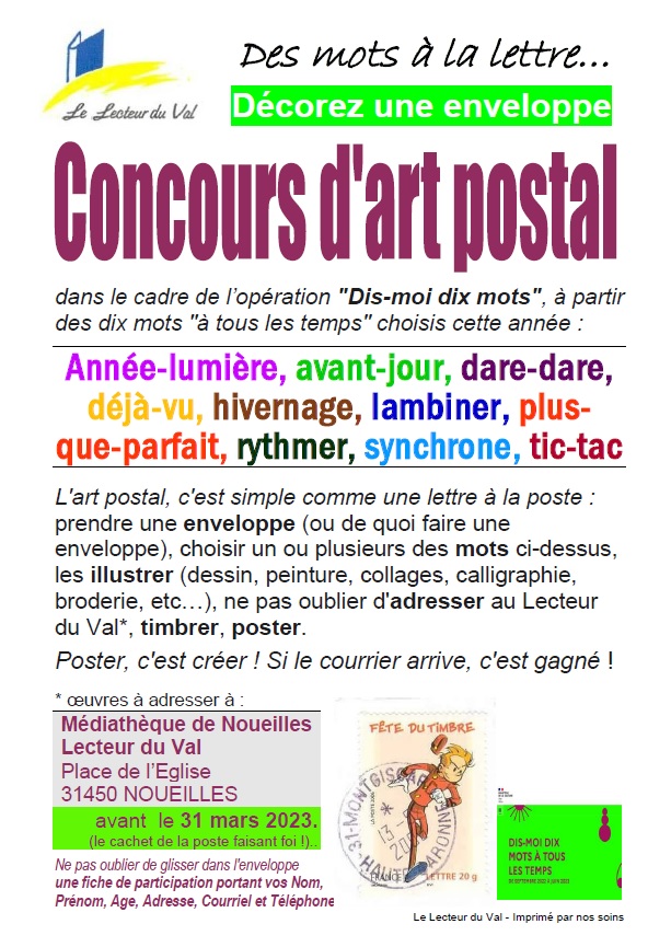 Dans le cadre de l’Opération "Dis-moi dix mots", Le Lecteur du Val propose un concours d’art postal consistant à illustrer, sur une enveloppe qui voyagera par la Poste, les "Dis-moi dix mots à tous les temps" proposés cette année par la Délégation Générale à la Langue Française et aux Langues de France :