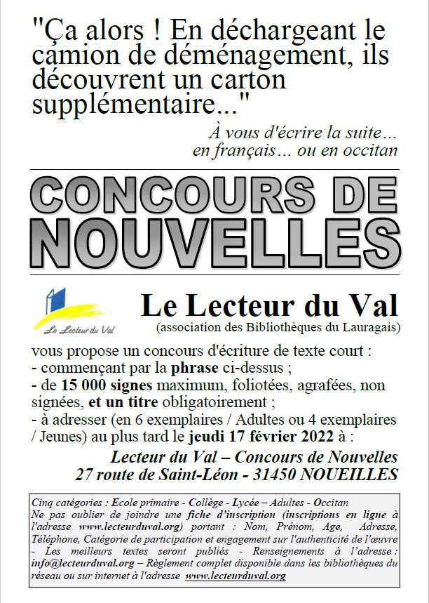 Le Lecteur du Val (association de bibliothèques du Lauragais) propose pour la 24e année consécutive un concours de nouvelles ouvert tous, enfants, jeunes et adultes, jusqu’au 17 février 2022