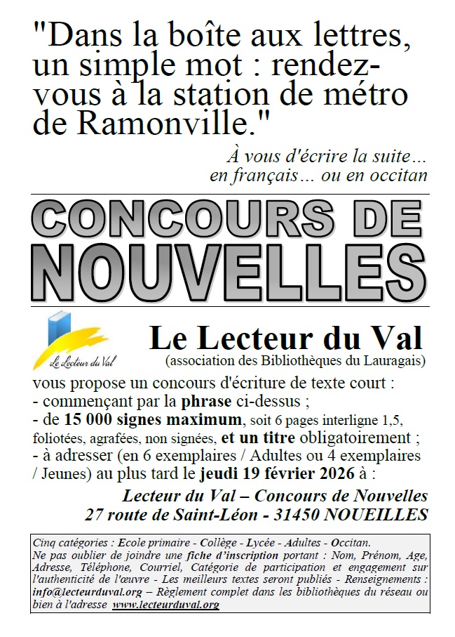La participation à ce concours (ouvert jusqu’au 19 février 2026) est gratuite. Chaque année, les nouvelles sélectionnées par le Jury sont publiées dans un recueil réunissant une vingtaine de textes, toutes catégories confondues (enfants, jeunes collège, jeunes lycée, adultes – français et occitan) et lues et enregistrées sur Cd (pour les textes en occitan).