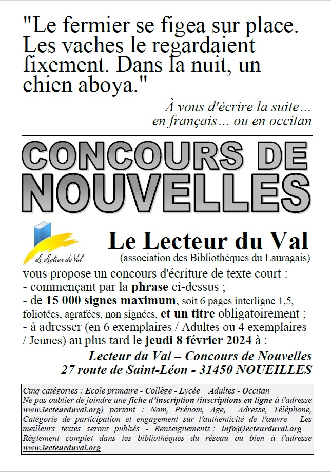 Le Lecteur du Val (association de bibliothèques du Lauragais) propose pour la 26e année consécutive un concours de nouvelles ouvert tous, enfants, jeunes et adultes.Il s’agit d’écrire un texte court (6 pages/15 000 signes maxi) commençant par une phrase donnée.