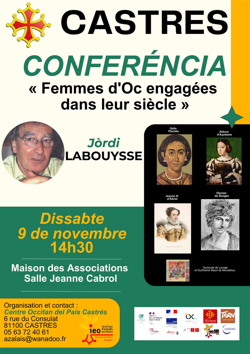 Jòrdi Labouysse viendra nous présenter sa conférence-diaporama « Femmes d’Oc engagées dans leur siècle », le samedi 9 novembre 2024, à 14h30, à la salle Jeanne Cabrol de la Maison des Associations (Place du 1er Mai - 81100 Castres).