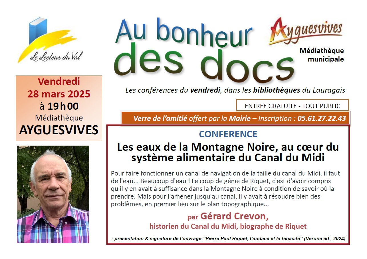 > Dans le cadre de sa saison 2025 des rencontres "Au Bonheur des Docs", le Lecteur du Val, en partenariat avec la médiathèque d’Ayguesvives, invite à une conférence de Gérard Crevon, sous le titre : "Les eaux de la Montagne Noire, au cœur du système alimentaire du Canal du Midi", le vendredi 28 mars à 19 h 00, à la Médiathèque.