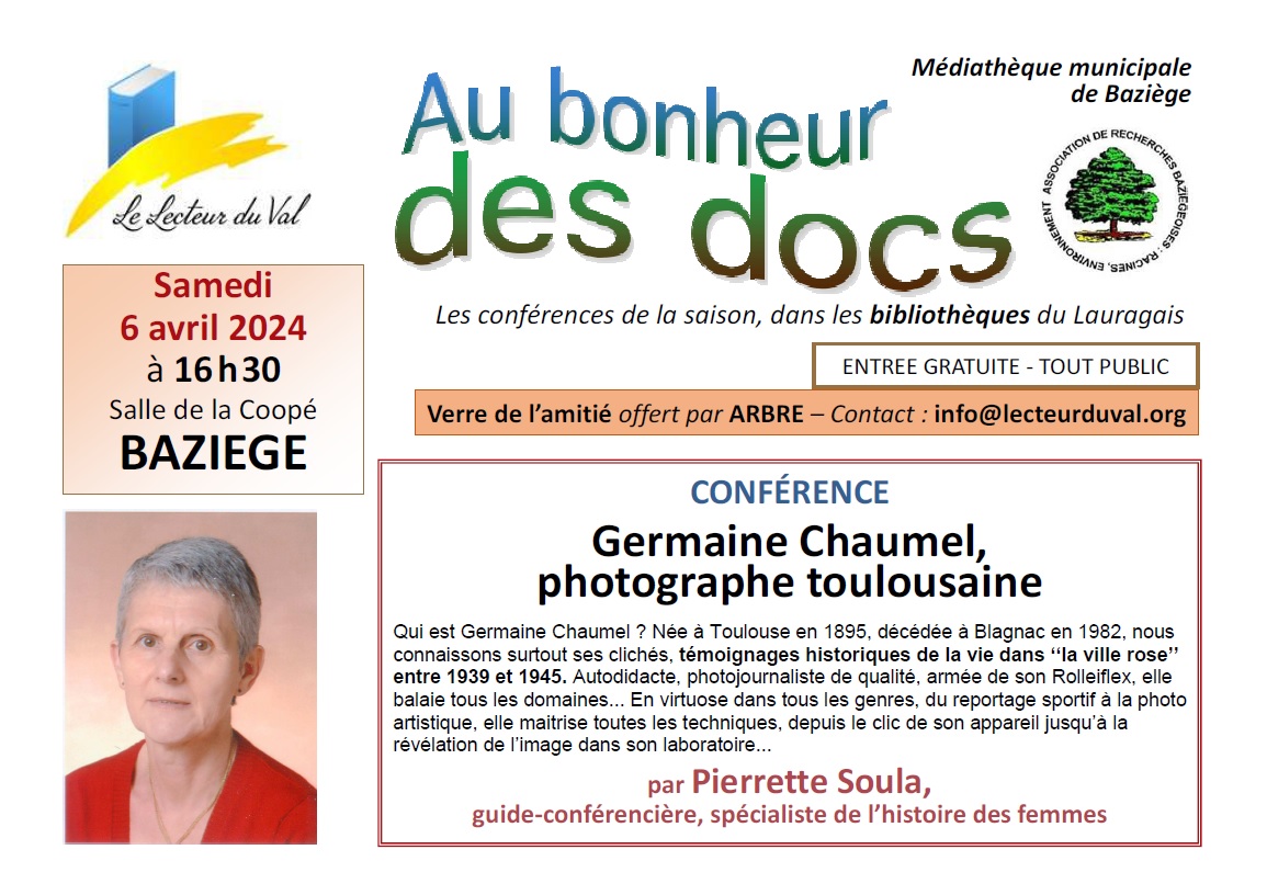 Pour ce nouveau rendez-vous de la saison 2024 des rencontres "Au Bonheur des Docs", le Lecteur du Val, en partenariat avec l’association Arbre et la médiathèque de Baziège, invite à une conférence de Pierrette Soula sur Germaine Chaumel, femme, toulousaine, photographe, le samedi 6 avril à 16 h 30, à la salle de la Coopé à Baziège.