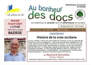 Dans le cadre de sa saison de conférences « Au Bonheur des Docs » (toujours sur des thématiques liées au fonds local-régional que l’association développe), le Lecteur du Val, en partenariat avec l’association ARBRE et la Médiathèque de Baziège, invite à une rencontre avec Raymond Ginouillac sur le thème : "Histoire de la Croix occitane", le samedi 8 avril 2023, à 17 heures, à la salle de la Coopé à Baziège.