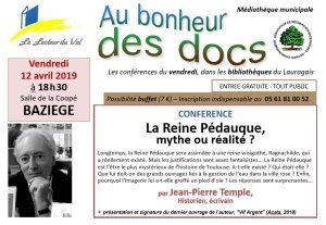 Dans le cadre de sa saison de conférences « Au Bonheur des Docs » (toujours sur des thématiques liées au fonds local-régional que l’association développe), le Lecteur du Val, en partenariat avec l’association ARBRE et la Médiathèque de Baziège, invite à une rencontre avec Jean-Pierre Temple, sur le thème : "La Reine Pédauque : mythe ou réalité ?", le vendredi 12 avril 2019, à 18 h 30, à la salle de la Coopé à Baziège.