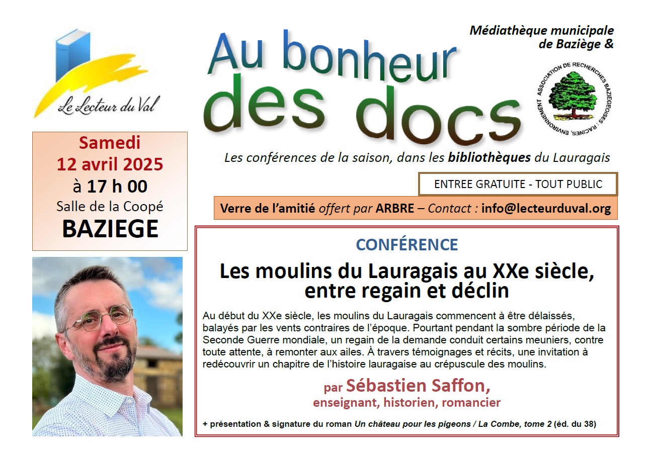 Pour son nouveau rendez-vous de la saison 2025 des rencontres "Au Bonheur des Docs", le Lecteur du Val, en partenariat avec l’association ARBRE et la médiathèque de Baziège, invite à une conférence de Sébastien Saffon, sous le titre : "Les moulins du Lauragais au XXe siècle, entre déclin et regain", le samedi 12 avril à 17 h, à la salle de la Coopé.