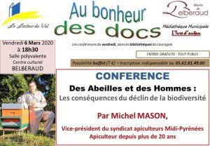La nouvelle saison de rencontres « Au Bonheur des Docs » se poursuit ! Pour son prochain rendez-vous, le Lecteur du Val, en partenariat avec la médiathèque de Belberaud, invite à une conférence de Michel Mason, sous le titre : "Des abeilles et des hommes", le vendredi 6 mars, à 18 h 30, au Centre culturel (salle polyvalente jouxtant la médiathèque).