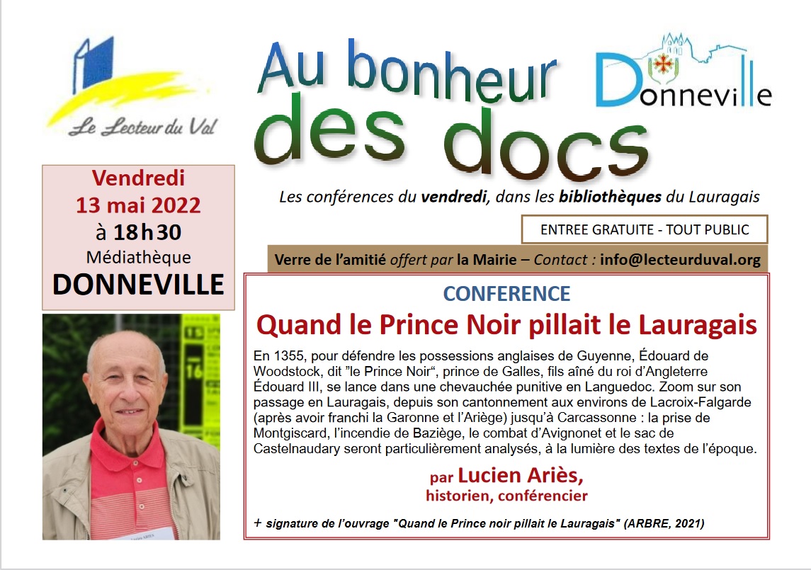 Pour son dernier rendez-vous de la saison 2021-22 des rencontres « Au Bonheur des Docs », le Lecteur du Val, en partenariat avec la médiathèque de Donneville, invite à une conférence de Lucien Ariès, sous le titre : "1355. Quand le Prince Noir pillait le Lauragais", le vendredi 13 mai à 18 h 30, à la Médiathèque de Donneville.