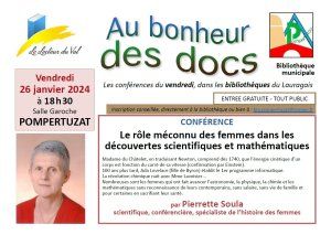 > n ouverture de sa saison de conférences 2024 « Au Bonheur des Docs » (toujours sur des thématiques liées au fonds local-régional que l’association développe), le Lecteur du Val, en partenariat avec la Bibliothèque de Pompertuzat, invite à une rencontre avec Pierrette Soula sur le thème : "Le rôle méconnu des femmes dans les découvertes scientifiques et mathématiques", le vendredi 26 janvier 2024, à 18 h 30, à la salle Garoche (derrière la salle des fêtes) à Pompertuzat.