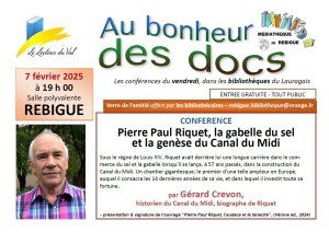 Pour son second rendez-vous de la saison 2025 des rencontres "Au Bonheur des Docs", le Lecteur du Val, en partenariat avec la médiathèque de Rebigue, invite à une conférence de Gérard Crevon, sous le titre : Pierre-Paul Riquet, la gabelle du sel et la genèse du Canal du Midi, le vendredi 7 février à 19 h 00, à la salle polyvalente de Rebigue.