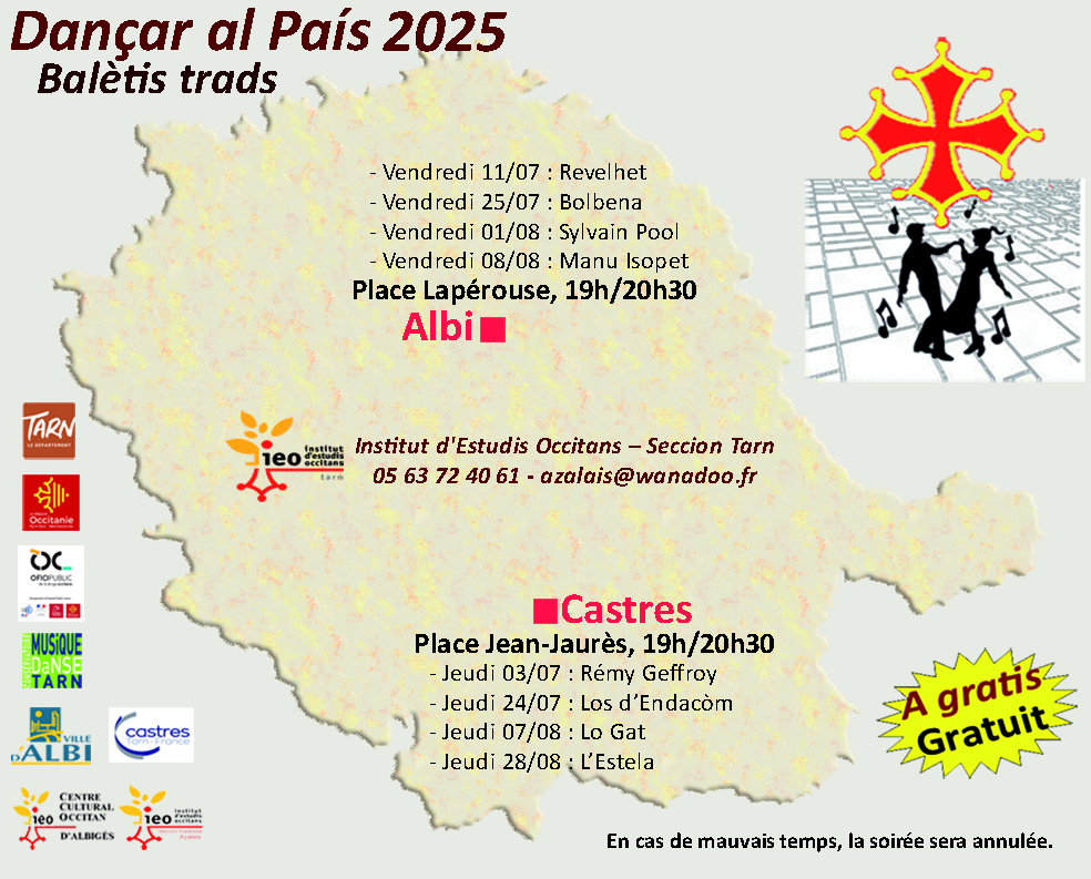 L’Institut d’Études Occitanes – Section Tarn et le Centre Culturel Occitan de l’Albigeois vous donnent rendez-vous tout l’été, les vendredis soirs, tous les quinze jours, au son des grailes, crabas, vielles, bohas, percussions, harpes, guitares, etc. Gratuit !