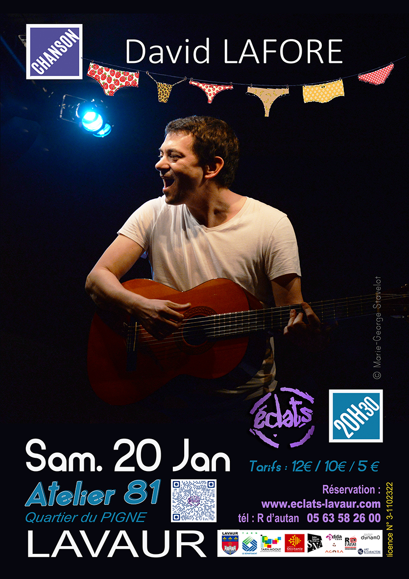 David Lafore vous attend sur la scène de l’atelier 81, le 20 janvier prochain à 20h30 pour un concert-spectacle à mi- chemin entre le one man show et le récital classique . Seul en scène, tout acoustique, on dirait pourtant qu’ils sont plusieurs ! Un chanteur, auteur, compositeur évidemment, mais aussi un comédien, tour à tour tragique et burlesque, dingue et mélancolique. Une performance à ne pas manquer en ce début d’année 2024 !