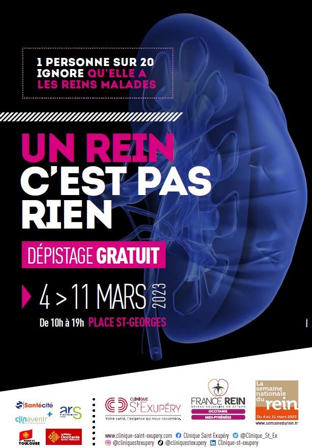 À Toulouse, une vaste campagne de dépistage anonyme et gratuit des maladies rénales se tiendra du samedi 4 au samedi 11 mars de 10h à 19h Place St- Georges. Cette opération est organisée par l’association de patients insuffisants rénaux, France Rein Occitanie Midi Pyrénées, en partenariat avec la clinique St-Exupéry.