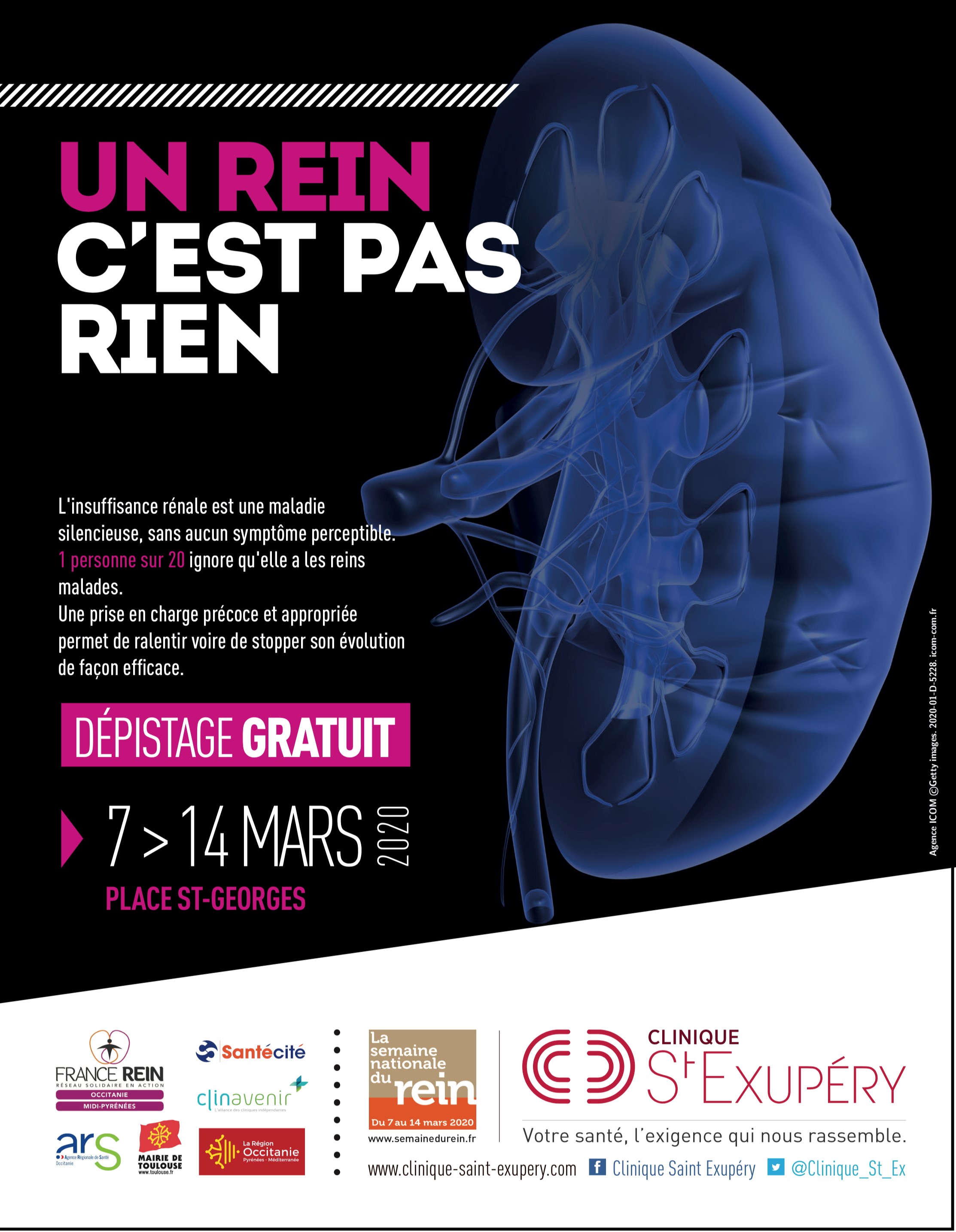 Plus que jamais déterminée à ce que le grand public puisse vérifier le bon fonctionnement de ses reins, la Clinique Saint Exupéry en partenariat avec France Rein Occitanie Midi-Pyrénées organise un dépistage gratuit, anonyme et indolore dans le cadre de la Semaine Nationale du Rein du 7 au 14 mars prochain, Place Saint Georges à Toulouse.