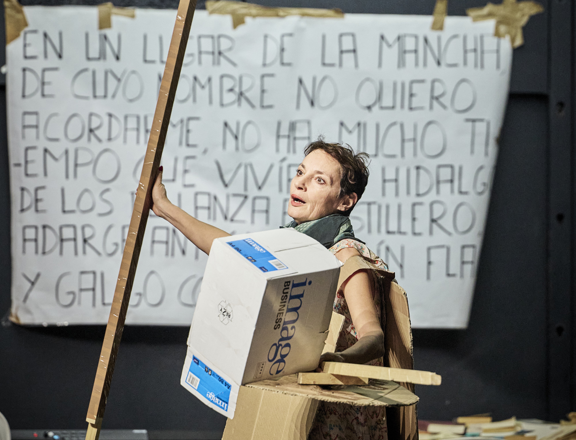 Il s’attaque cette fois au Quichotte avec délectation, des bouts de carton et Jeanne Balibar. Cette égérie du cinéma d’auteur en a vu d’autres, qui a déjà interprété des rôles masculins au théâtre (Achille, Galilée, et même le diable dans une adaptation des Frères Karamazov). Morin, qui racontait l’an passé dans Libé l’avoir choisie pour le rôle titre du fait de son côté « post-Sarah-Bernhardt » et de sa nature de citoyenne engagée en faveur des migrants ou de la cause féminine, lui fait camper un hidalgo définitivement affranchi du genre et de la réalité. Elle est accompagnée de Marie-Noëlle Pelloquin, à la fois narratrice et Rossinante, et flanquée d’un Sancho Panza chanteur et compositeur incarné par Thierry Dupont, un comédien de la compagnie roubaisienne L’Oiseau-Mouche. Le metteur en scène s’est quant à lui réservé quelques apparitions en Rubio, l’âne de Sancho, qui se montre ici plus têtu et indépendant que jamais. SV
