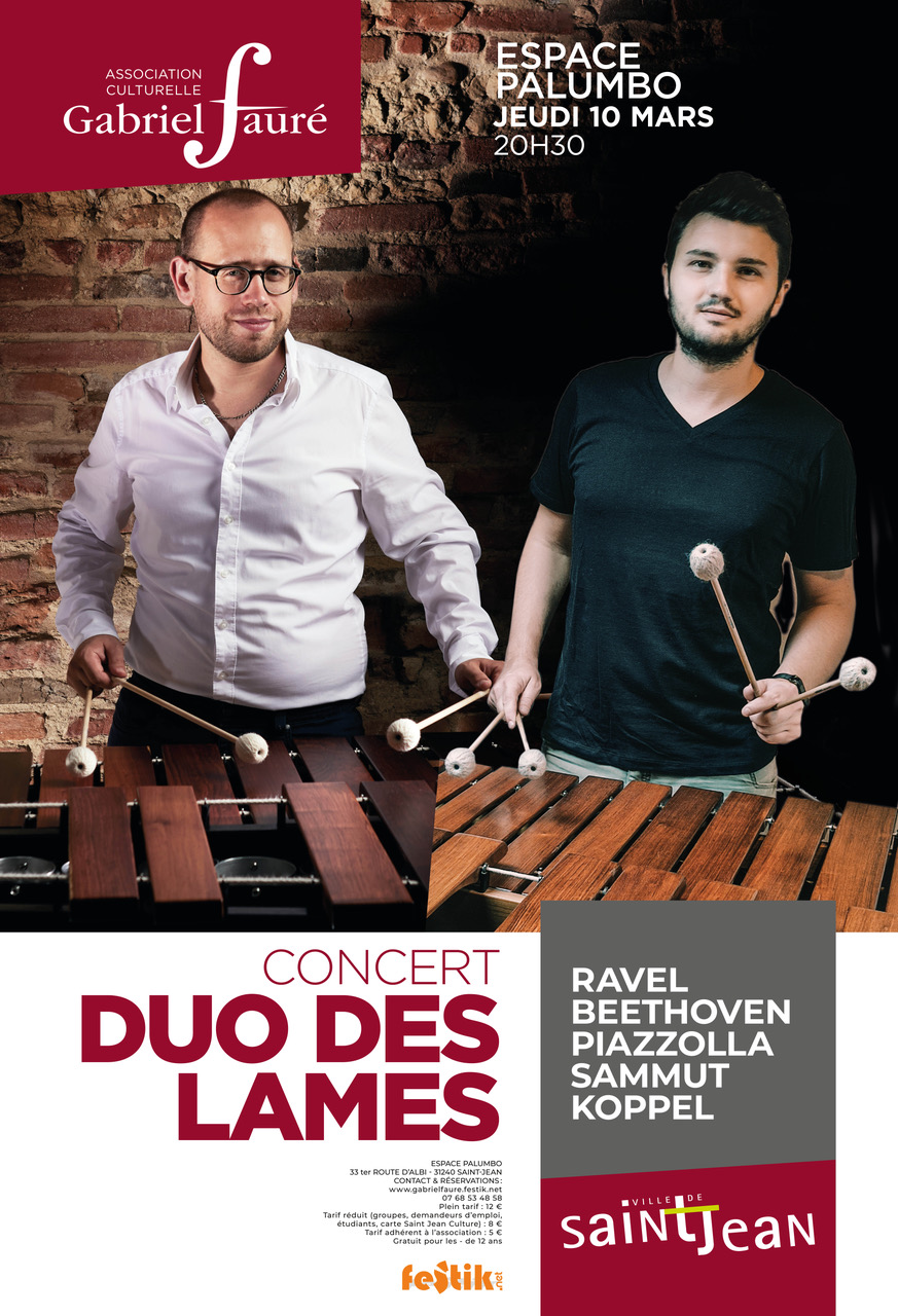Le duo des lames, fondé en 2021 par Jean-Sébastien Borsarello (timbalier solo de l’Orchestre National du Capitole) et Geoffrey Saint-Léger, explore les possibilités sonores des instruments à claviers de percussion que sont le marimba et le vibraphone. Leur répertoire comprend à la fois des compositions originales pour cette formation d’Eric Sammut, d’Anders Koppel, de Toru Takemitsu, et des transcriptions d’œuvres de Maurice Ravel et d’Astor Piazzolla. Les deux musiciens allient les timbres de deux marimbas ou bien d’un marimba et d’un vibraphone, selon les pièces, et interprètent un programme haut en couleurs et riche en émotions, incluant également une petite incursion dans le jazz….
