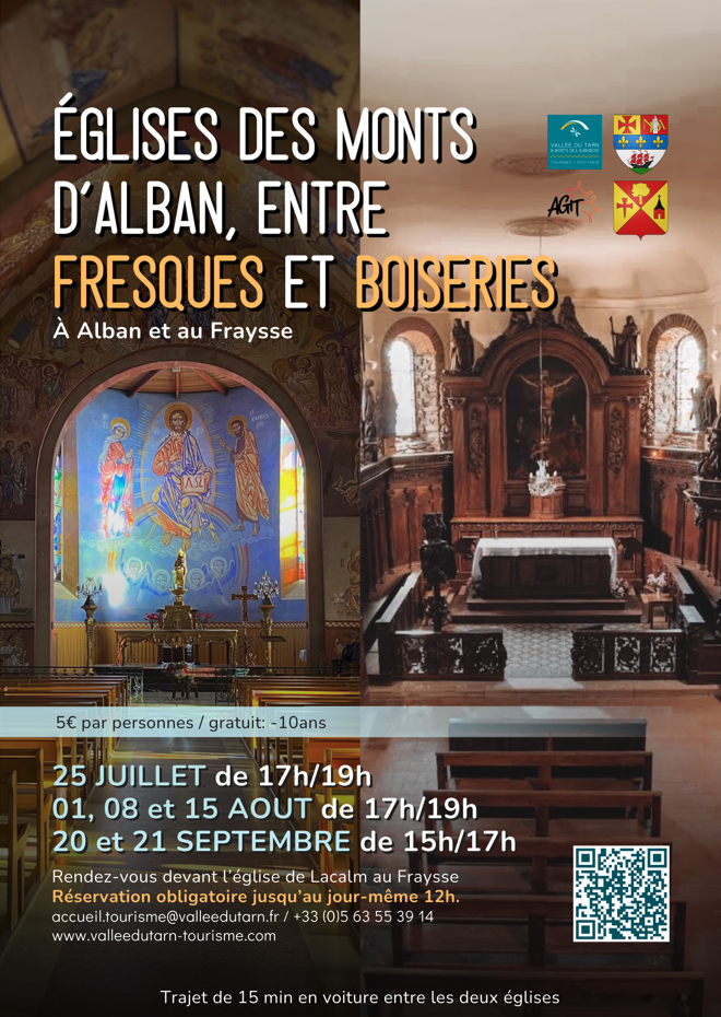 L’église Notre-Dame d’Alban, véritable bible illustrée, abrite l’un des décors peints les plus aboutis du célèbre fresquiste Nicolaï Greschny. Celle de Lacalm, située sur la commune du Fraysse et dédiée à St Jean, présente, quant à elle, un ensemble remarquable de boiseries sculptées par Pierre Paul Laclau et classées aux Monuments Historiques depuis 1959. Laissez-vous enchanter par cet exceptionnel patrimoine religieux en Vallée du Tarn. En partenariat avec les mairies du Fraysse et d’Alban.